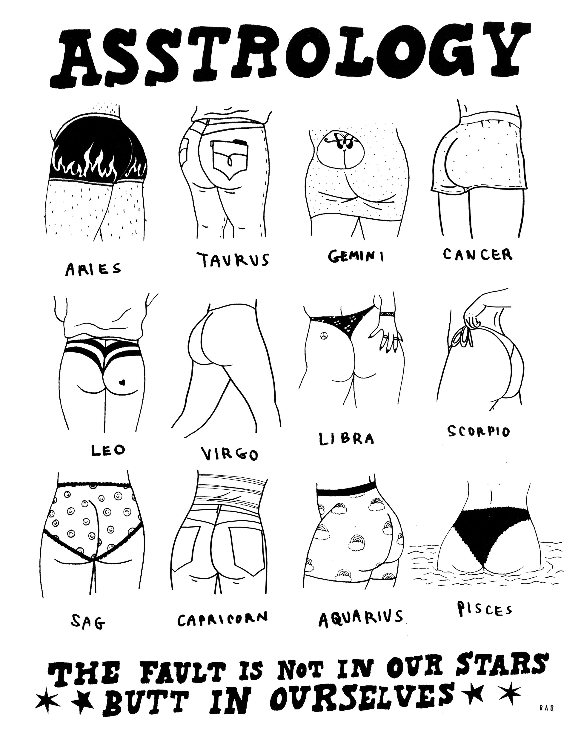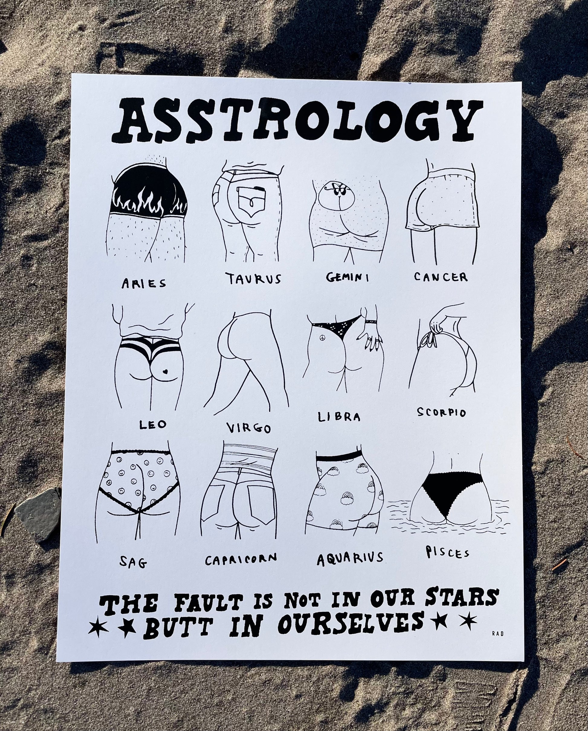 What does your sign say about your butt? This zodiac booty poster was made in collaboration with Lesley Numbers! The poster dimensions are 11 x 14 inches.