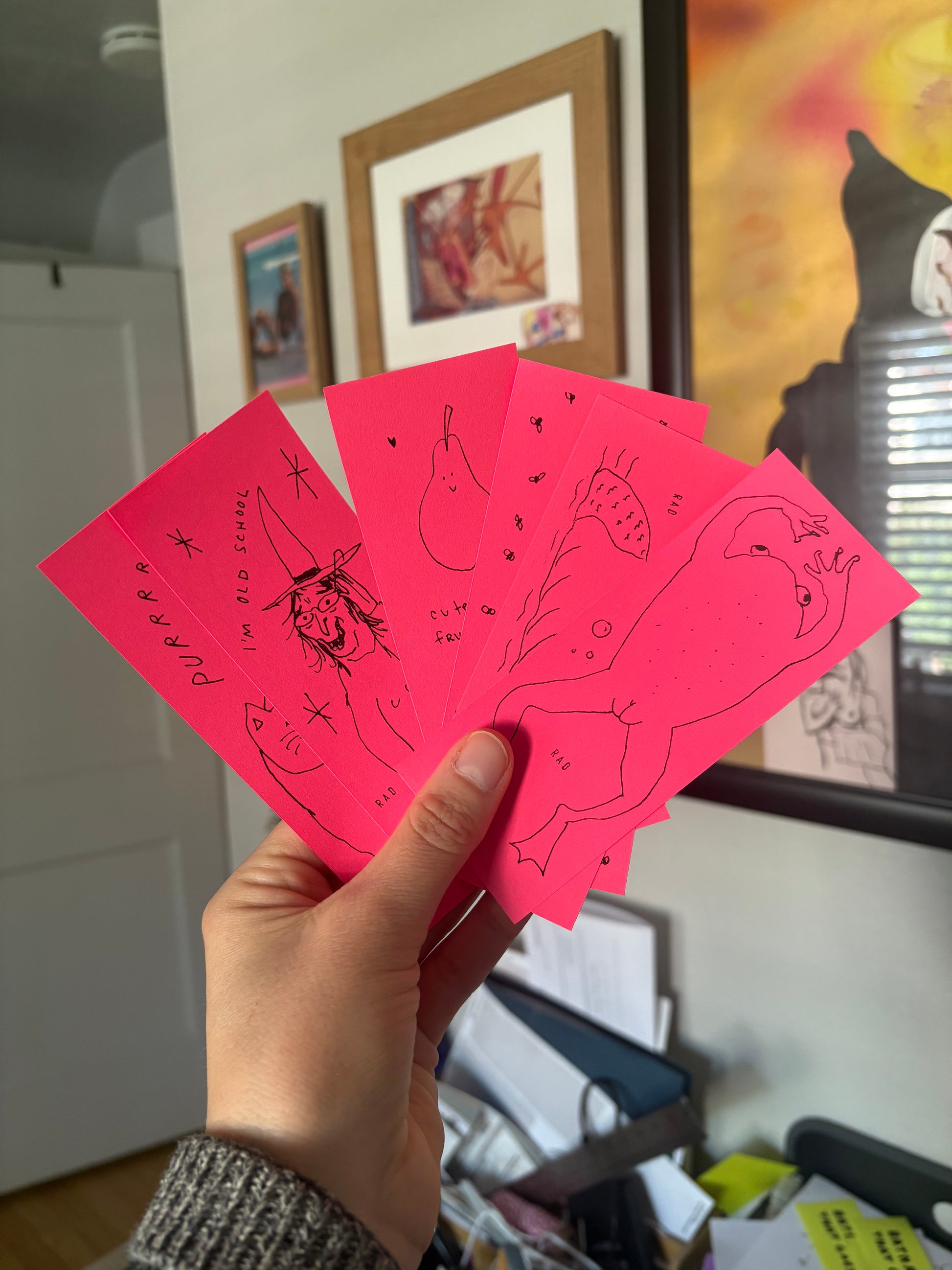 Do you like books and doodles? Look no further! Here we have a batch of illustrated bookmarks featuring a witch, duck, butts, a cat and much more! So much to enjoy. Keep a few and share some with friends!