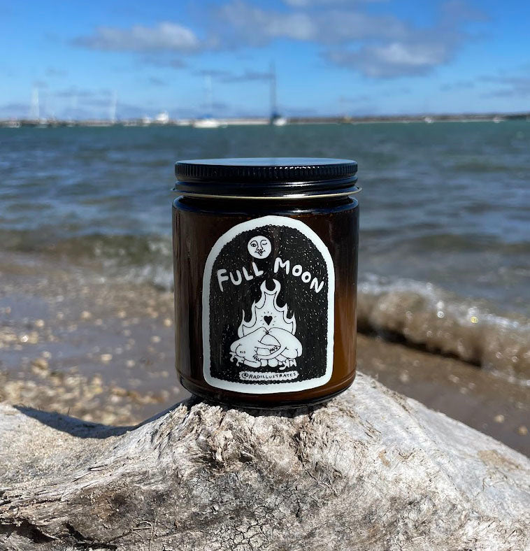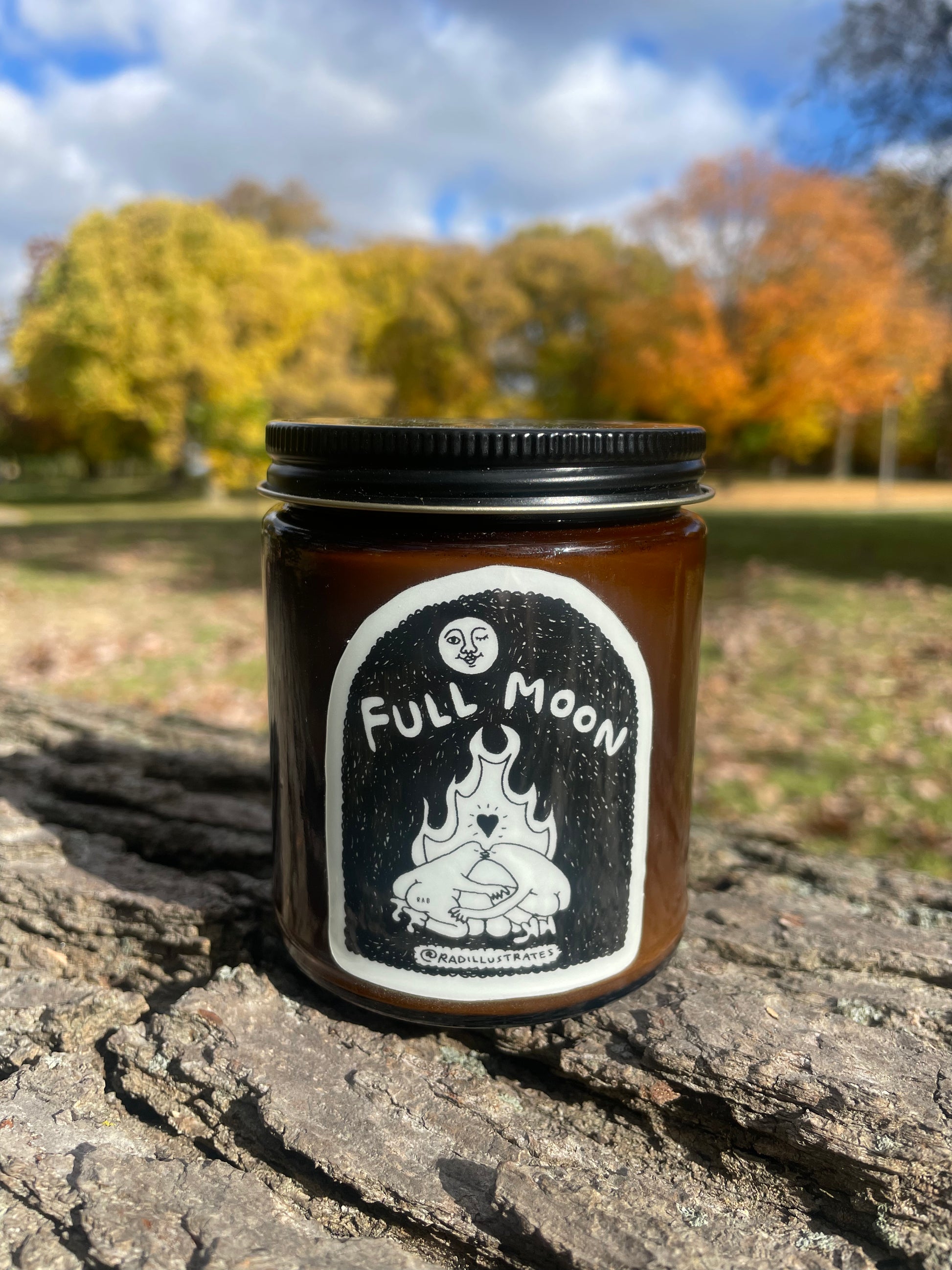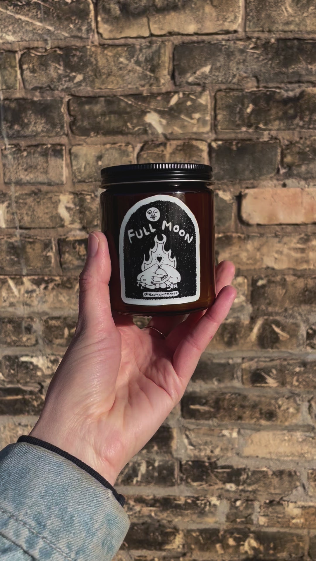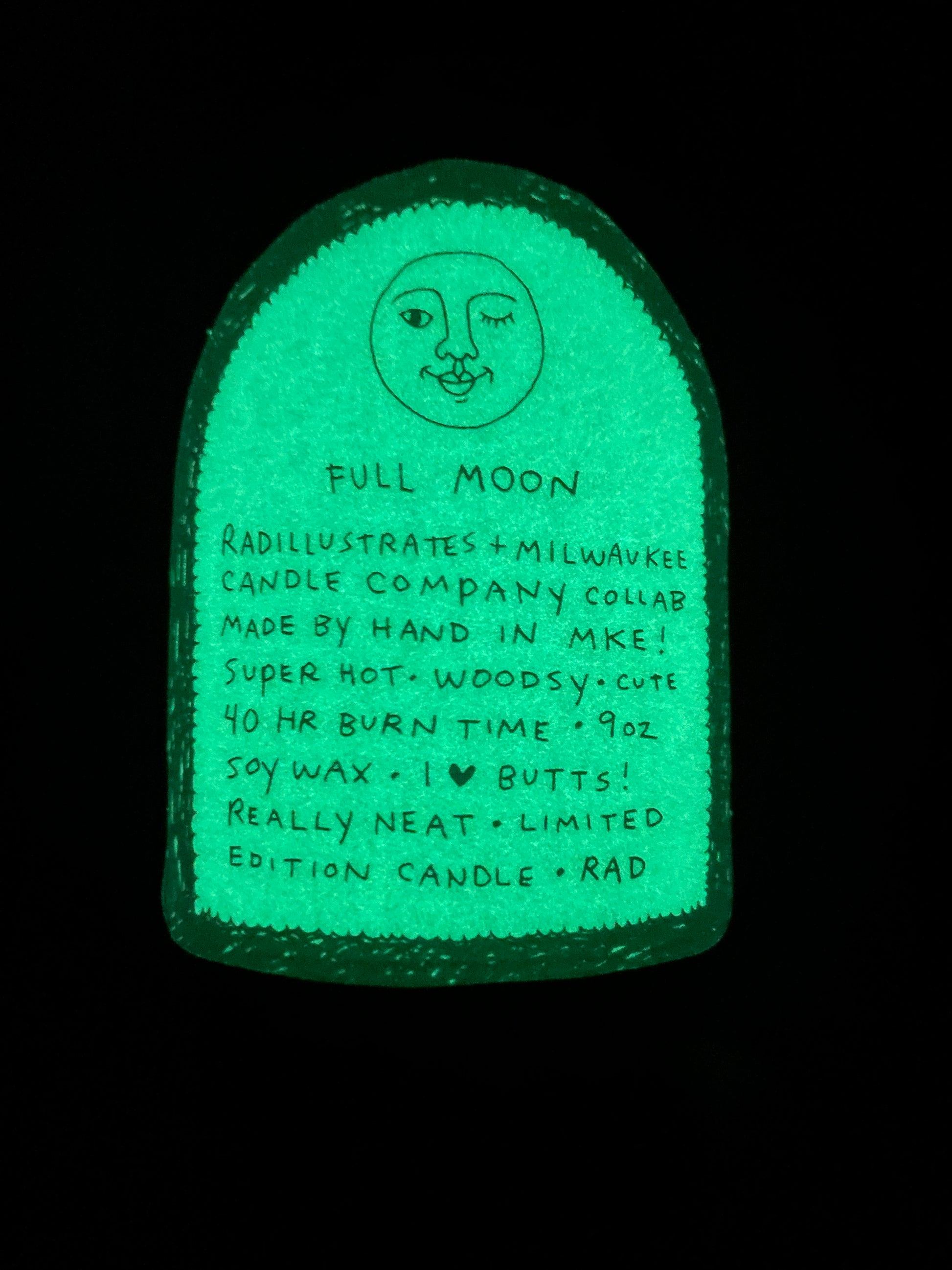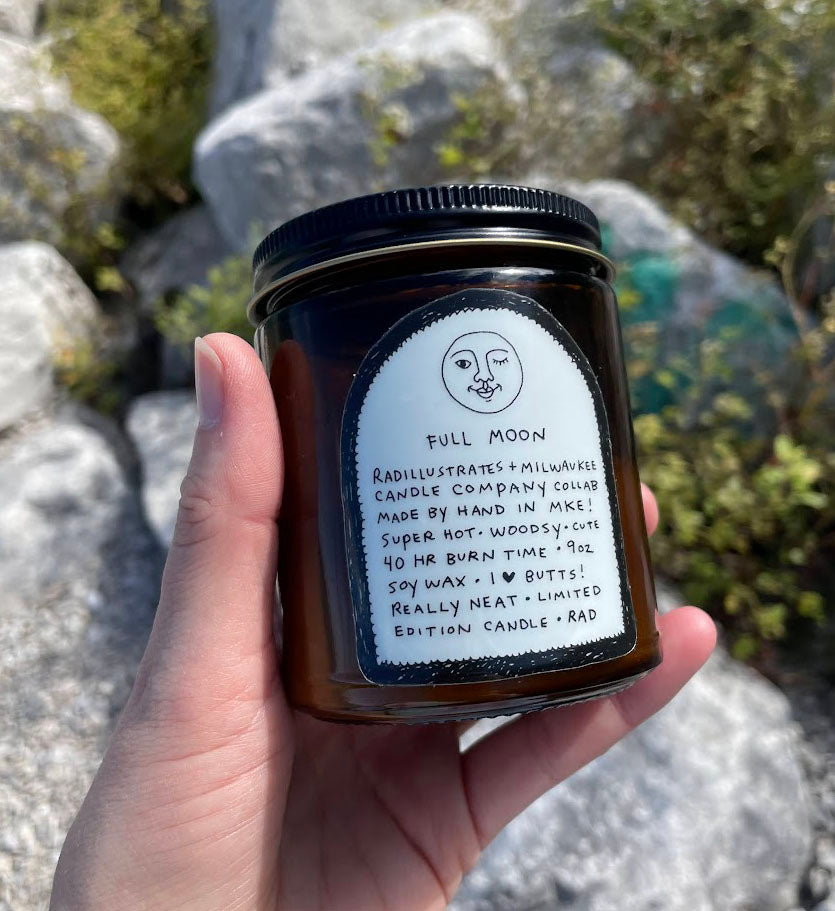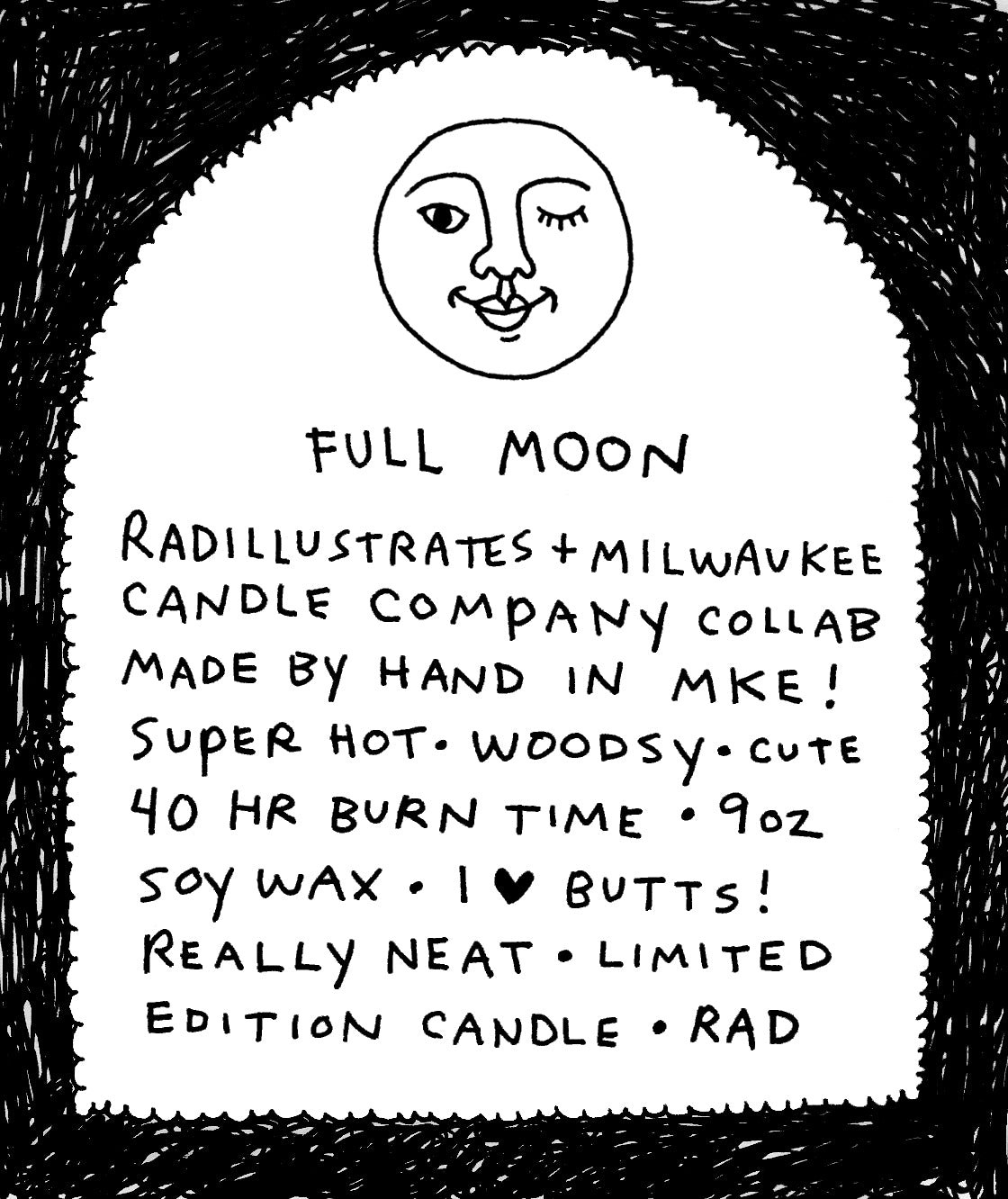 Introducing...Radillustrates x Milwaukee Candle Co. collab of a lifetime! This candle is sultry. It's romantic. It's spooky. It's woodsy. It's full of mystery -- just like the full moon!