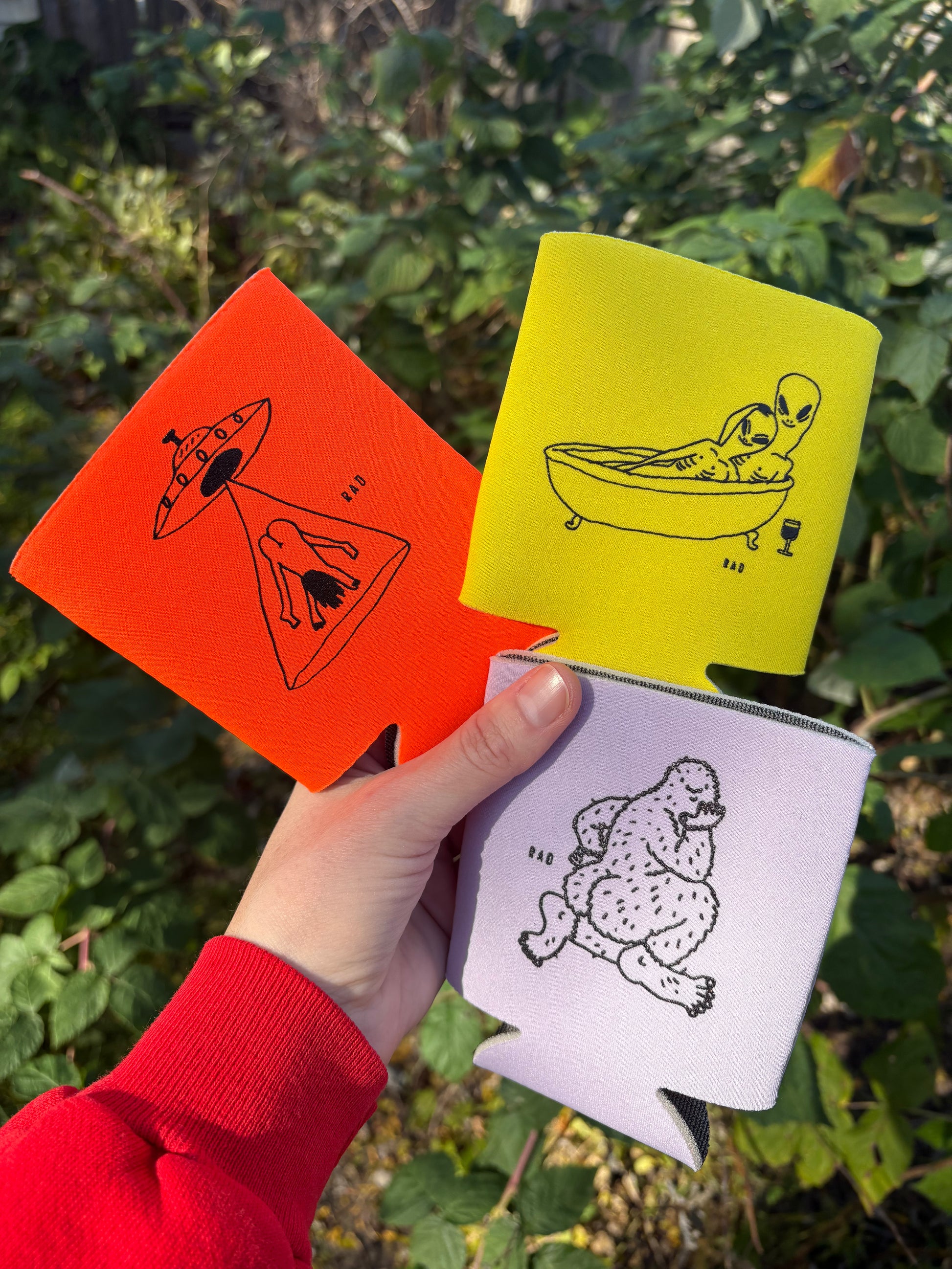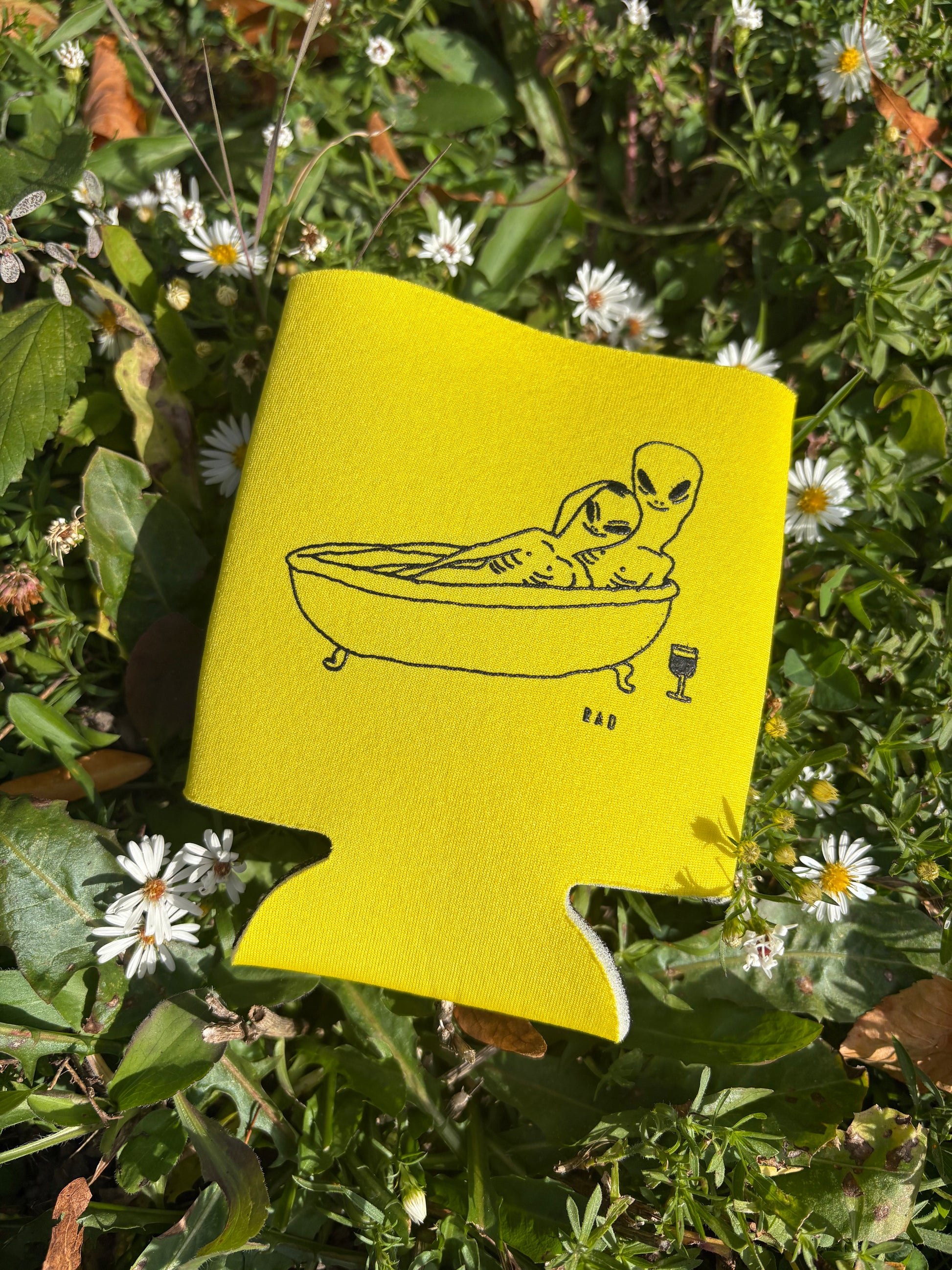 3. Alien Tub Lovers Can Cooler: Buttery pure yellow featuring 2 alien lovers in the tub. So in love. Black ink. Made in the US.
